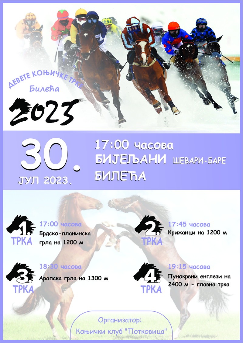 "Saglasno općim odredbama Pravilnika o organizaciji i izvođenju konjičkih trka, Konjički klub «KRAJIŠNIK» Velika Kladuša organizuje velike Međunarodne konjičke trke na hipodromu Drmaljevo, dana 23.09.2023. godine."