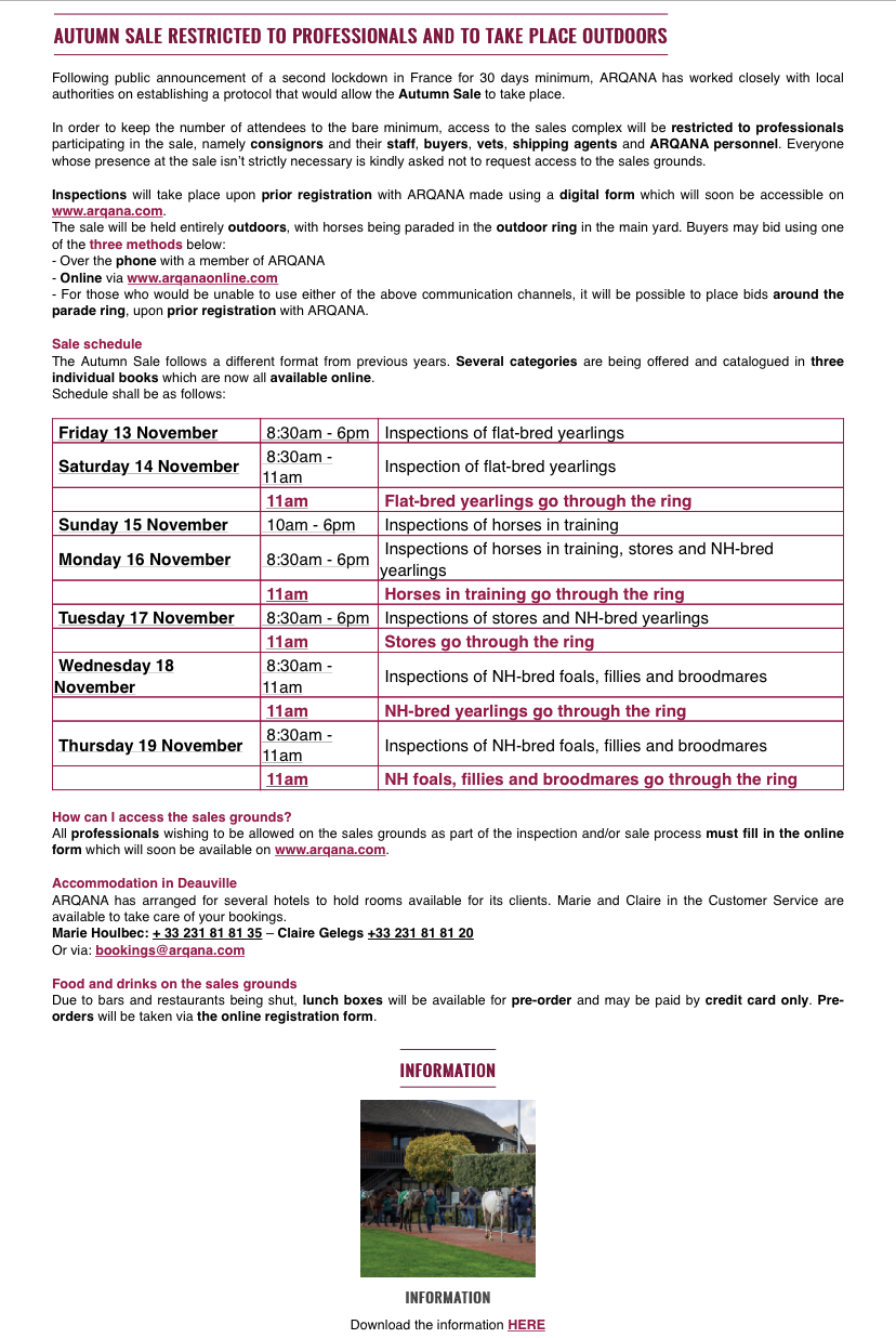 Aukcija će se održati na otvorenom. Pristup inspekciji grla i samoj aukciji dozvoljen je ISKLJUČIVO profesionalnom osoblju: prodavcima, kupcima, veterinarima, trenerima i njihovom najužem osoblju.