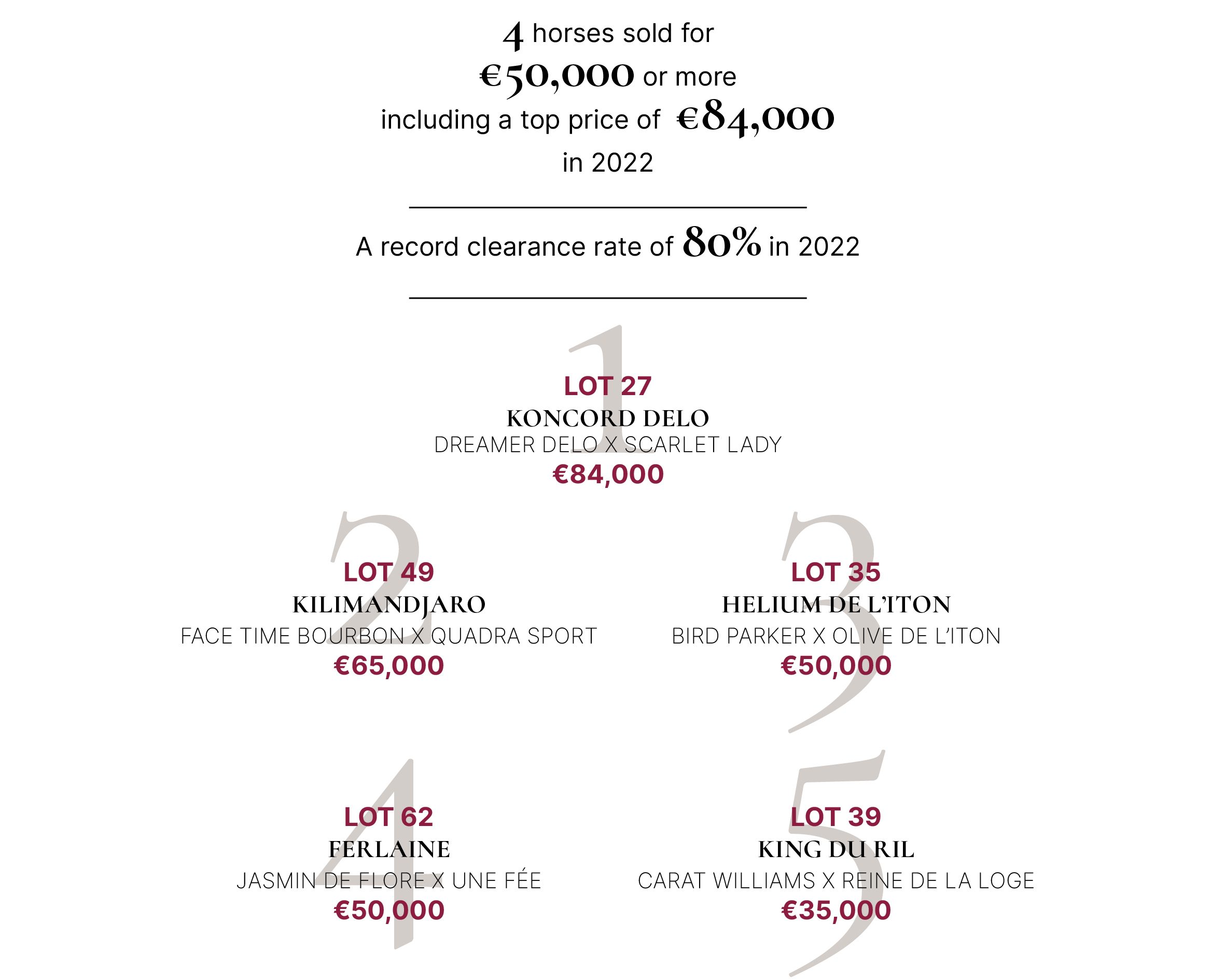 U ponudi će biti grla u treningu, jarlinzi, ždrebne kobile, omice iz treninga, pastuvi i učešče u vlasništvu pastuva. Prošle godine, 2022, procenat prodatih grla je bio 890% uz prosečnu cenu €13,690 sa ukupnim obrtom od €1,259,500..