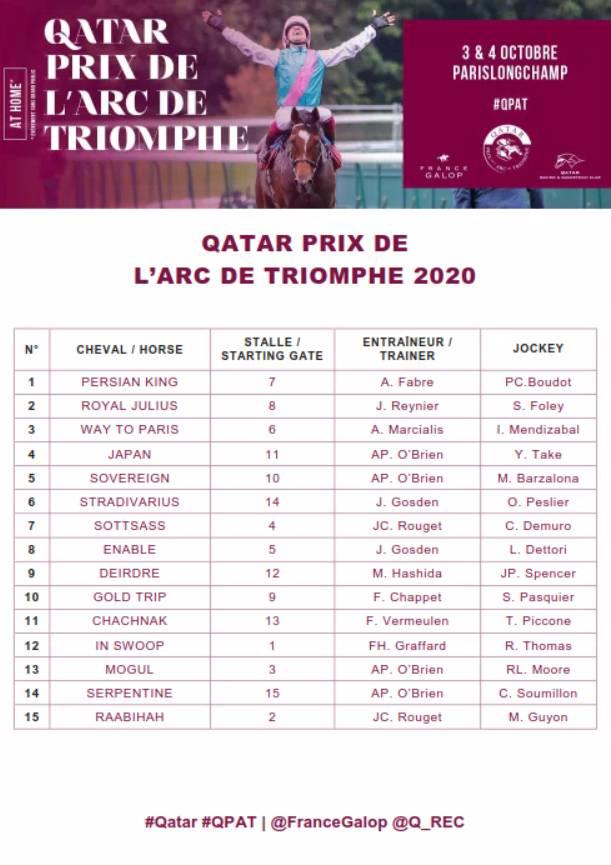 Dva grla koja je Enable nakon poraza u julu u "Eclipse Stakes" izbegla na Ebor York festivalu (Ghaiyyath - "Juddmonte International", Love - "Yorkshire Oaks") i koja su ove godine ostavila najbolji utisak u pripremnim trkama nažalost neće startovati. Ghaiyyath nam je kasnim upisom a i porazom u "Irish Champion Stakes" dao do znanja da nešto tu nije u redu i da sigurno neže trčati Arc; najavljen je za "British Champion Stakes" na 2000m 17.oktobra. Love, kobila neverovatne lakoće trčanja, nije "stvorena" za tešku stazu koja će posle obilnih kiša biti u Parizu; najavljen njen start u Breeders' Cup Turf početkom novembra.