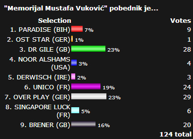 Nagrade: 1. Mjesto 1200 KM 2. Mjesto 500 KM 3. Mjesto 300 KM Upisnina 3% (na ukupan fond nagrade)