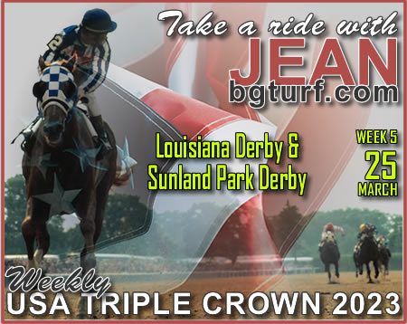 Brad Cox also has two and he comes in better represented.  INSTANT COFFEE will, of course, be the favorite and deservedly so.  He has won three of his four starts, the last being in the LA Derby prep, the LeComte Stakes. In that one, he defeated Rebel Stakes winner Confidence Game (so far, my choice for the Kentucky race) who will be the probably favorite in the Arkansas Derby next weekend.  Instant Coffee is by Bolt D'Oro out of stakes placed Follow No One (by Uncle Mo).  He will be ridden by Luis Saez and I totally expect him to cross the wire in front.   JACE'S ROAD is the other to be saddled by Mr Cox who has lost a lot of supporters with a lackluster 5th in the Southwest Stakes (to Arabian Knight, now out of the Derby).   That has been his only start this year but at two, he won half of his 4 starts and that included a win in the Gun Runner Stakes at Fair Grounds.  That race was at 8.5furlongs.   His works have been steady, all at Oaklawn.   Jace's Road is by Quality Road who was tossed off the Derby trail in 2009 with injuries.  he did go on to be quite the racehorse, winning 5 grades stakes after the Florida Derby (at 3 & 4) and he's turning out to be a good sire (Emblem Road, City of Light, Abel Tasman, etc).  Dam of Jace's Road is sprint stakes placed Out Post, by Silver Deputy (Can).