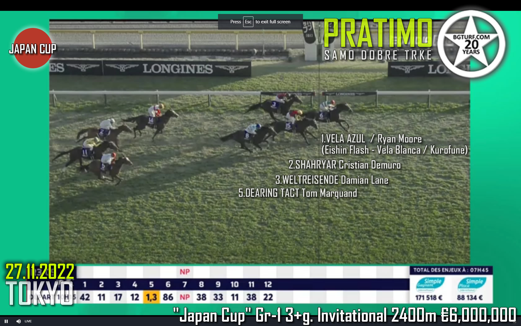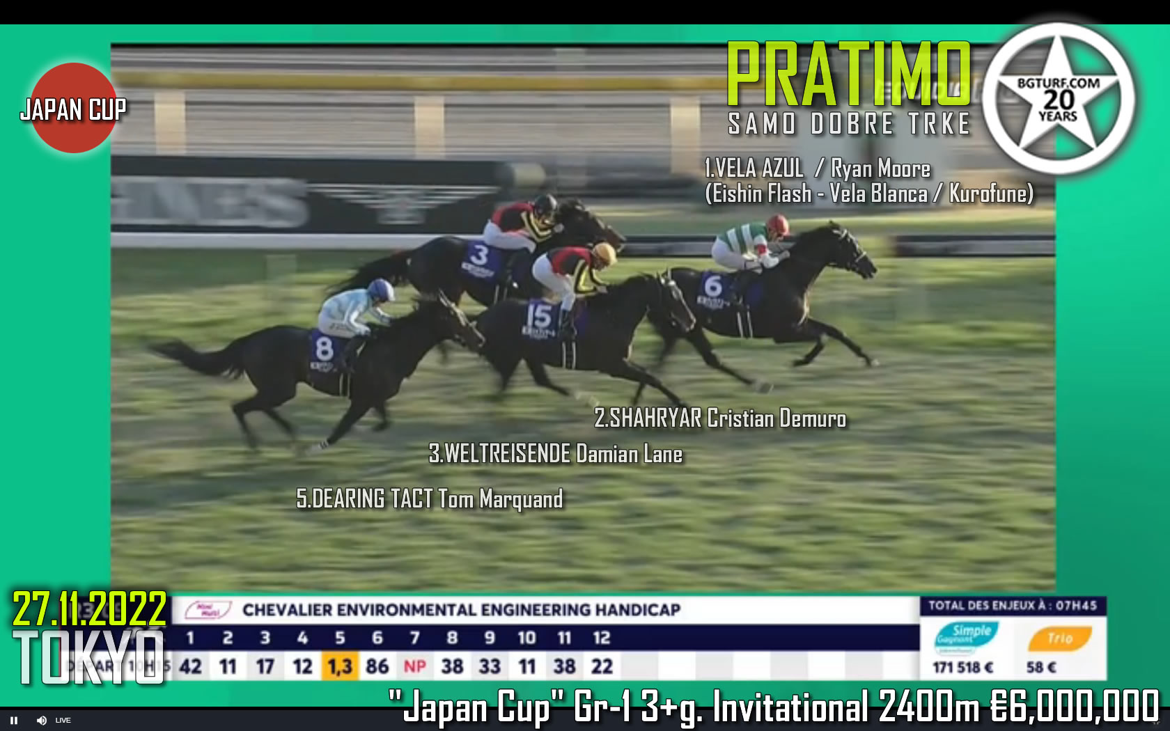 Od starta kao što smo i najavili, Geraldina je poslednja napustila start mašinu, a Titleholder je odmah prigrabio čelo. Pratili su Justna Palace, Boccherini i prošlogodišnji pobednik Efforia. U drugoj polovini grupe je bio Equinox sa Lemaire-om u sedlu, dok je jedan od favorita i nedavni pobednik Japan Cup-a Vela Azul bio na začelju, kao i Boldog Hos. Titlehilder je trčao kao i u Arc-u, trudeći se da što više pobegne grupi. U kontra pravcu sve je više manje ostalo nepromenjeno, a Equinox i Efforia su se pozicionirali spolja. Oni su na ulazu u ciljni pravac krenuli u napad, kao i Vela Azul i Boldog Hos. Več na pola pravca je bilo jasno da će Cristophe lemaire, omiljeni džokej bgturf-a, uvesti po treći put pobedničko grlo u cilj ove trke. Komotno sa dve i po dužine prednosti, Equinox je opravdao poverenje na kladionici (2.favorit) i doneo trofej svojoj štali Silk Racing i treneru Tetsuya Kimuri.Vreme 2:32,4 na 2500m! Zato iznova poručujemo, gledajte japanske trke, na delu rezultate reda, rada i poštenog pdnosa prema vlasnicima koji troše svoj novac i publici koja na totalizator kladionici ostavlja uloge.